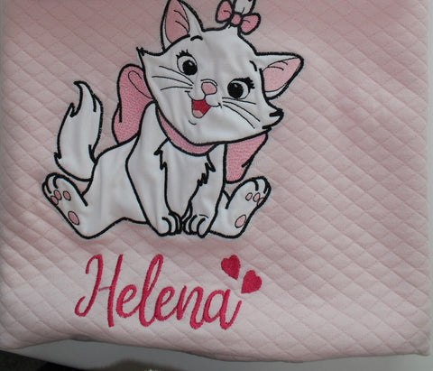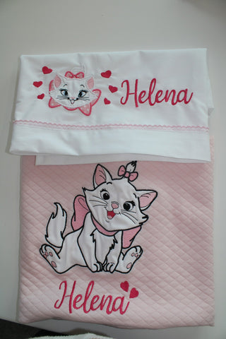 Per la piccola Helena copertina in cotone e lenzuola con la piccola e dolcissima minous degli aristogatti, con nome personalizzato.