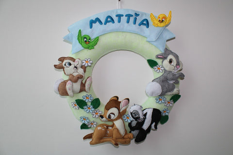 Per il piccolo Mattia fiocco nascita bambi e i suoi amici tamburino, coniglietta la puzzola fiore in un prato di fiori, il nome ricamato su una fascia con due simpaticissimi uccellini.
