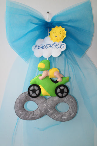 Per il piccolo Federico fiocco nascita bimbo su moto, in pista a forma di infinito, con nuvola con nome ricamato e sole.