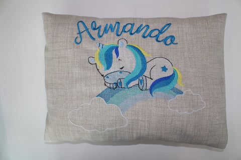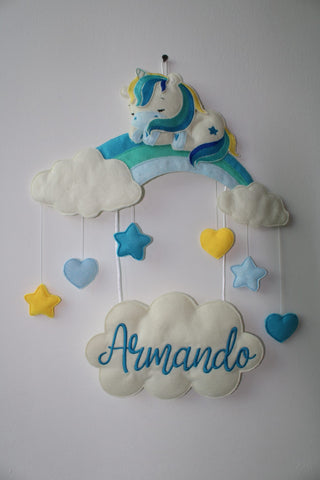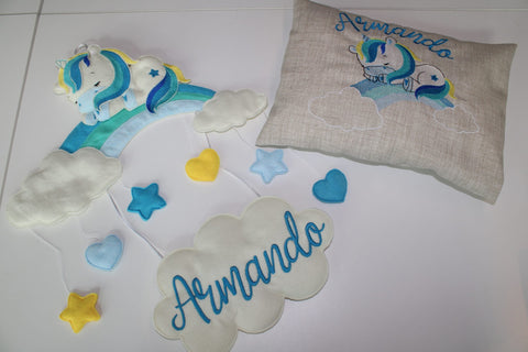 Per il piccolo Armando fiocco nascita con unicorno e arcobaleno, stelline e nuvola con nome ricamato e cuscino abbinato da appoggiare sulla culla o sul lettino.