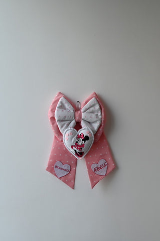 Per Adele fiocco nascita in tessuto rosa e bianco a cuori con cuore con ricamata minnie e cuoricini con benvenuta e il nome.