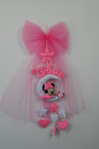 Per Chloe fiocco nascita minnie con cascata di stelle e cuori e fiocco in tulle rosa intenso.