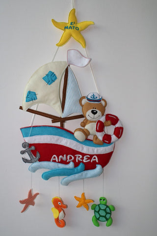 Per Matteo super novità, solo da BABYWOW con dolce orsetto marinaio su barca, e pendenti stelle marine, tartaruga e cavalluccio marino.