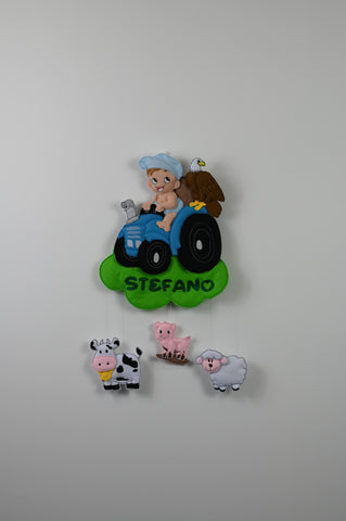 Per Stefano fiocco nascita bimbo su trattore e prato con nome ricamato, con animali, mucca, maialino con fango, pecora e aquila.